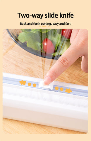 SAFETY CUT: This item is safe to use and do notworry about cutting fingers, it is designed tomake the cutting surface neat. Cling film cutterwith the two-way sliding blade can be cut neatlvit helps cut the wrap easily and quickly.