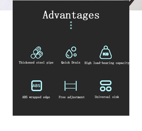 Advantages: fast draining, free adjustment, ABS wrapped edge, thickened steel pipe, strong load-bearing capacity, sink universal, easy to clean, multi-functional use